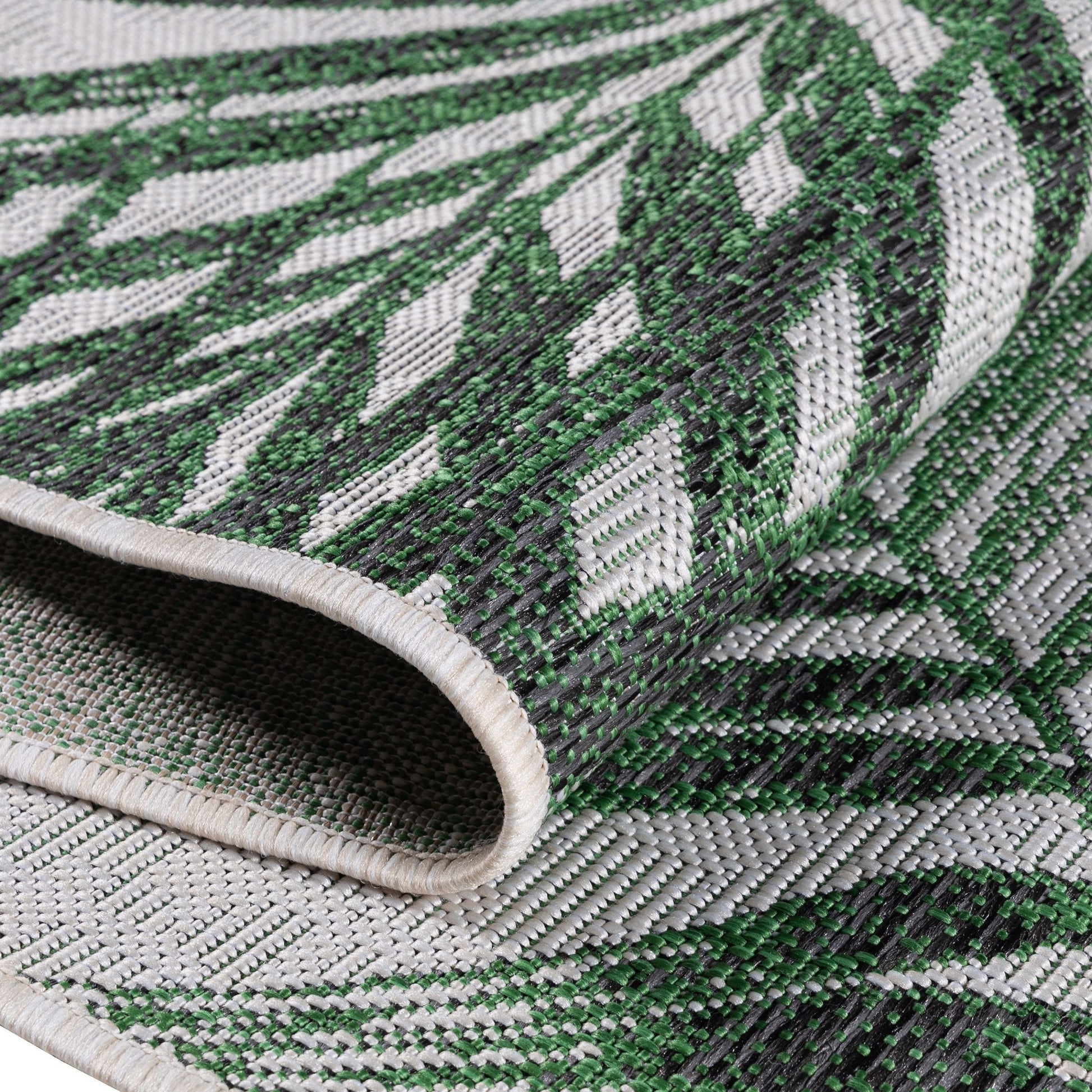 90 % Polypropylene, 10 % Polyester 100 % PP. Heatset Friese, Florhöhe: 3 mm, 86.900 Points, 1300 gr (±%5)M2, Rücken aus Polypropylen Outdoorteppiche, Palmen Design, Farbe Grün, Teppich für Terasse-Balkon-Küche, Rücken aus Polypropylen